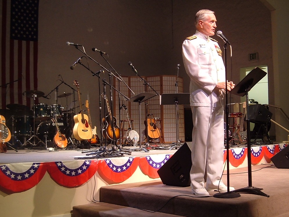 | "I will tell you one thing. Those of you on this side of the equation suffer the most. I have been on both sides. In World War II, I bid my brother goodbye along with all of my cousins and my brother's friends who I knew well. It was agonizing day after day, censored letters, V-mail, or no letters for months at a time, fear of a phone call or a telegram, not knowing what danger they were in and when it would all end. Four years later I went into the service and a year after that the Korean War began, and I said goodbye to my parents and siblings at a brief shoreleave as I went off to war. It is easier to do that, that is to go off to war, than to stay home and see a loved off to the conflicts. Hence I say, 'Hats off to you, Blue Star Mothers, and bless you for your sacrifices and good deeds.'" RADM Paul K Arthur joined the Navy 56 years ago. He was an enlisted sailor for 13 and an officer for 25 more. He retired after 38 years of Navy and Naval Reserves service. He also retired last year from White Sands Missile Range working for the Army, for a total service time of 55 years. |