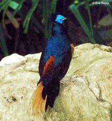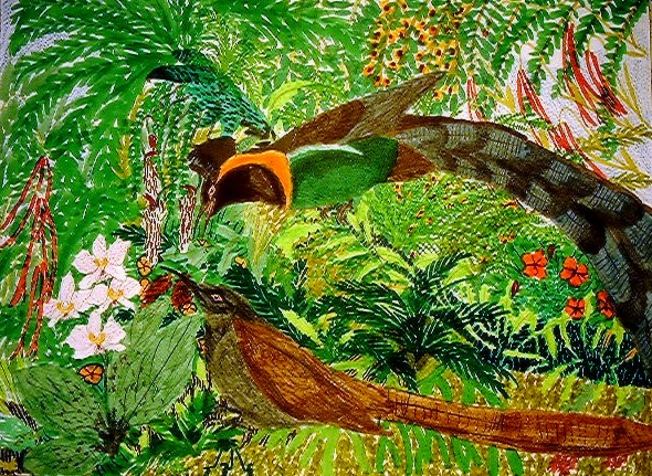 | Arfak Astrapia - I drew this picture because I saw a similar but much larger one of different birds at an Indonesian restaurant. This is a picture of two Arfak Astrapias from Indonesia. The top bird is the male. Some of the background foliage is from Indonesia that I found pictures of on-line. I mailed this picture to an Indonesian man we met at the restaurant. His name is Gustaaf. |