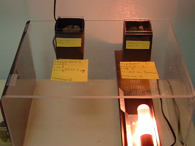 | Experiment 2. We planted two seeds in one box and put black paper around the box except the bottom and we put a light underneath. We planted two seeds in another box and we wrapped black paper all around it except the top. We did these thing to see if light effected the direction of the sprouting. In the first box both seeds grew straight up. In the second box both seeds grew straight up. Seeds grow straight up no matter where the light is. |