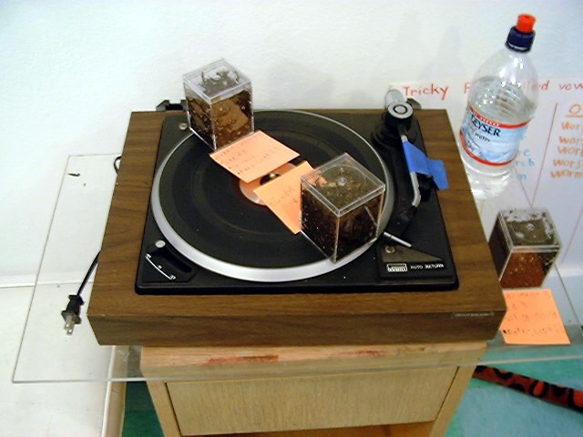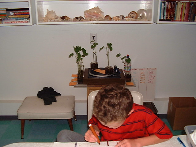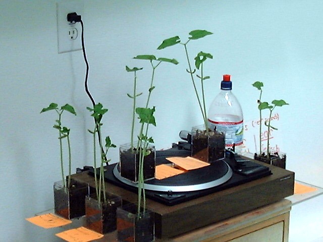 | Experiment 3. We planted two seeds in a box on one side of a record player. We planted two more seeds in another box on the other side of the record player. We planted two seeds in a box by the record player. We planted seeds on a record player because if gravity effects the direction of the sprouting, the record player spinning will too. Why? Gravity is a force that pulls down toward the center of the earth. The spinning record player makes a force that pulls the seeds straight out from the middle of the record player. If force is the reason seeds grow up, seeds on a spinning record player will sprout up a little bit and toward the middle a little bit, up because gravity pulls down, and toward the middle because spinning on a record player pulls straight out. Daddy took me out to our neighbor's yard and spun me around for a minute by my ankles and I found out that my head was pulled straight out. He spun me around to show me what happens to the seeds on the record player. We planted seeds by the record player to see that they don't lean because they are not spinning. The seeds on the record player leaned toward the middle. They spun on the record player for 11 days. The seeds by the record player after 11 days just grew straight up. We found out that gravity because it's a force causes seeds to grow up. |