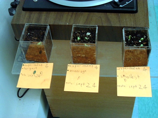 | Experiment 4. We planted four of the smallest seeds in the box on the right. We planted four of the average seeds in the box in the middle. We planted four of the biggest seeds in the box on the left. The biggest seeds grew the smallest plants. The average seeds grew medium sized plants. The smallest seeds grew the tallest plants. The biggest seeds sprouted two plants. The average seeds sprouted three plants. The smallest seeds sprouted three plants too. The smallest seeds are the healthiest and the biggest seeds are the least healthy. |