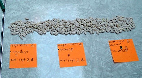 | How did we sort the seeds by size? We put a piled up line of seeds on the table and moved the biggest seeds on the right and the smallest seeds on the left. |