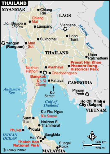 | Tell me about Thailand. Thailand is in southeast Asia. It is three-fourths of the size of Texas but it has 60 million people. Just to the east is Laos, The Land of a Million Elephants. Just to west is Burma which is now called Myanmar. To the southeast is Cambodia. Thailand extends down the Malay peninsula to Malaysia. The Gulf of Thailand is to the east. The Indian Ocean is to the west. Just a month ago there was a tsunami in the Indian Ocean. There are three seasons -- rainy, cool, and hot. Bangkok, the capital, is in the Central Plains which is a flat wet basin. Chang Mai is a city in the north where there are mostly mountains and hills. People love to find orchids and butterflies there. Both are raised in farms for export. The Pechabuns are a sparsely wooded mountain range in the northeast. Suren is one of the only cities there. Elephants are mostly in the northeast near Laos. Phuket is a city in the south on the long Malay peninsula that has rubber trees, coral reefs, jungles, beaches, and mangroves. In the south it is hot all through the year. People of Thailand. There are 30 ethnic groups. The main ones are Thai (75%), Chinese (19%), Malay (4%), and hill tribes (2%). Kids usually have nick names that are shorter than their real names. Ninety-five percent are literate. They don't use English letters because they have their own writing. It is rude to forget to wai (slightly bowing and folding your hands) to people who are older than you, as a show of respect. Wildlife in Thailand. There are more kinds of butterflies, birds, and animal there than just about anywhere else. The animals include Indian elephants, Bengal tigers, Sumatran rhinos, Chinese sun bears, many kinds of monkeys, dugongs, and the giant man-eating Mekong catfish. There is wildlife from almost anywhere in Asia. There is so much wildlife because it is hot, wet, and most forests haven't been cut down. It is illegal to cut down trees there. |