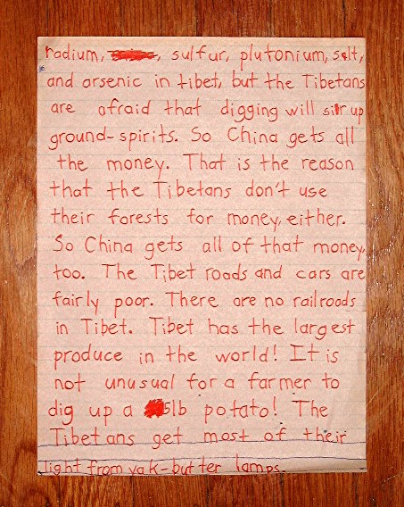 | FOURTH IMPOR-TANT THING ABOUT TIBET Some Americans really love Tibet. I think some Americans love Tibet because they love Buddhism and Tibet is the heart of Buddhism. We know that some Americans love Tibet because we see "Free Tibet" stickers on cars, and the Dalai Lama is very popular. |