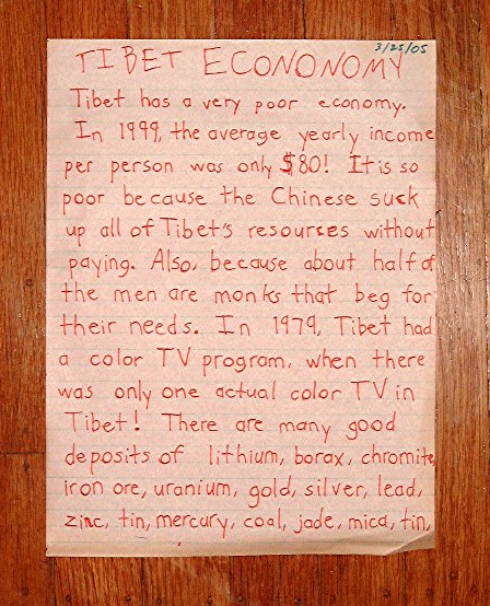 | SECOND IMPORTANT THING ABOUT TIBET Tibet is under the rule of China. In 1950, China took Tibet. They over ran it with their soldiers. Tibet agreed to be "liberated" at first but in 1959 Tibet said all agree-ments were void. China stopped the rebellion with a war and 80,000 people were killed in Lhasa. The Chinese say that they reclaimed a historical territory by conquering Tibet. They also took Tibet because of Tibet's many natural resources and to add to its empire. China confis-cated the animals and land mostly from monks' farms and redistributed them into group farms called communes. China is putting communism on Tibet. China also put new taxes on property. They also closed almost all of the monasteries and put restrictions on reli-gion. Families are only allowed to have two children by Chinese law and if they have a third they have to pay a fine of more than their yearly income. In China, families can only have one, so Chinese are moving to Tibet and col-onizing it. Chinese is the first language. Babies in Tibet are three times as likely to die as in China. |