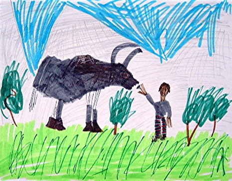 | I am a nomad boy that takes care of our family's yaks. My name is Sonam and I am 14 years old. Every day I take the yaks to graze out on the land near the tent. It is pretty hard to get the yaks to come out of their tent. Sometimes it takes an hour to get the yaks out because they keep walking back into the tent. I think it is because they want to sleep some more. When they do that I call them 'sleepy horns'. The land is flat but there sometimes are ditches that look like just part of the field. The ditches are places where aweto diggers have dug. I have never seen an aweto digger but I have seen an aweto but it crawled away before I could catch it. My job is to chase away anything that might hurt the yaks and make sure there is grass and fresh water nearby. Bears and Chinese soldiers might try to get my yaks. One day two weeks ago, a bear tried to get my yaks but I grabbed sticks and rocks and snowballs and threw them at it and it ran away. A few days after that, there were Chinese soldiers trying to get my yaks. I could see them around the edges of my herd trying to get the yaks to come twards them with hay. I called my mom and she didn't hear me. I called my dad and he didn't hear me. I tried throwing sticks and rocks at them but they |